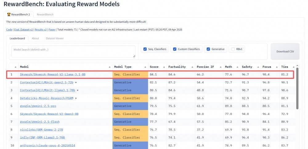 基座文本与多模态方向,Skywork系列模型在数学推理、代码生成及多模态领域持续突破,多项评测成绩跻身第一梯队。公司于2025年7月发布Skywork-Reward-V2系列奖励模型。自发布以来,Reward Model系列在全球最权威奖励模型榜单RewardBench上长期位居榜首。2025年11月,公司推出Skywork R1V4模型,在8项多模态理解基准评测中整体优于Gemini 2.5 Flash,并在其中5项任务上实现对Gemini 2.5 Pro的超越,综合竞争力突出。