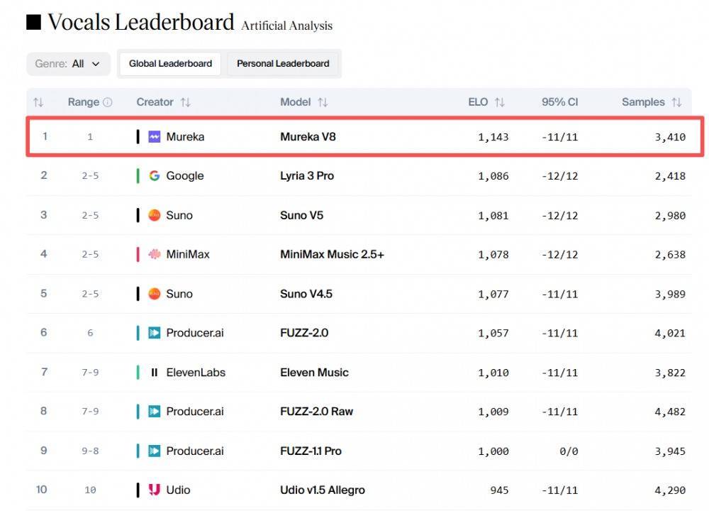 Mureka V8在Artificial Analysis Vocals(人声)中的排名表现